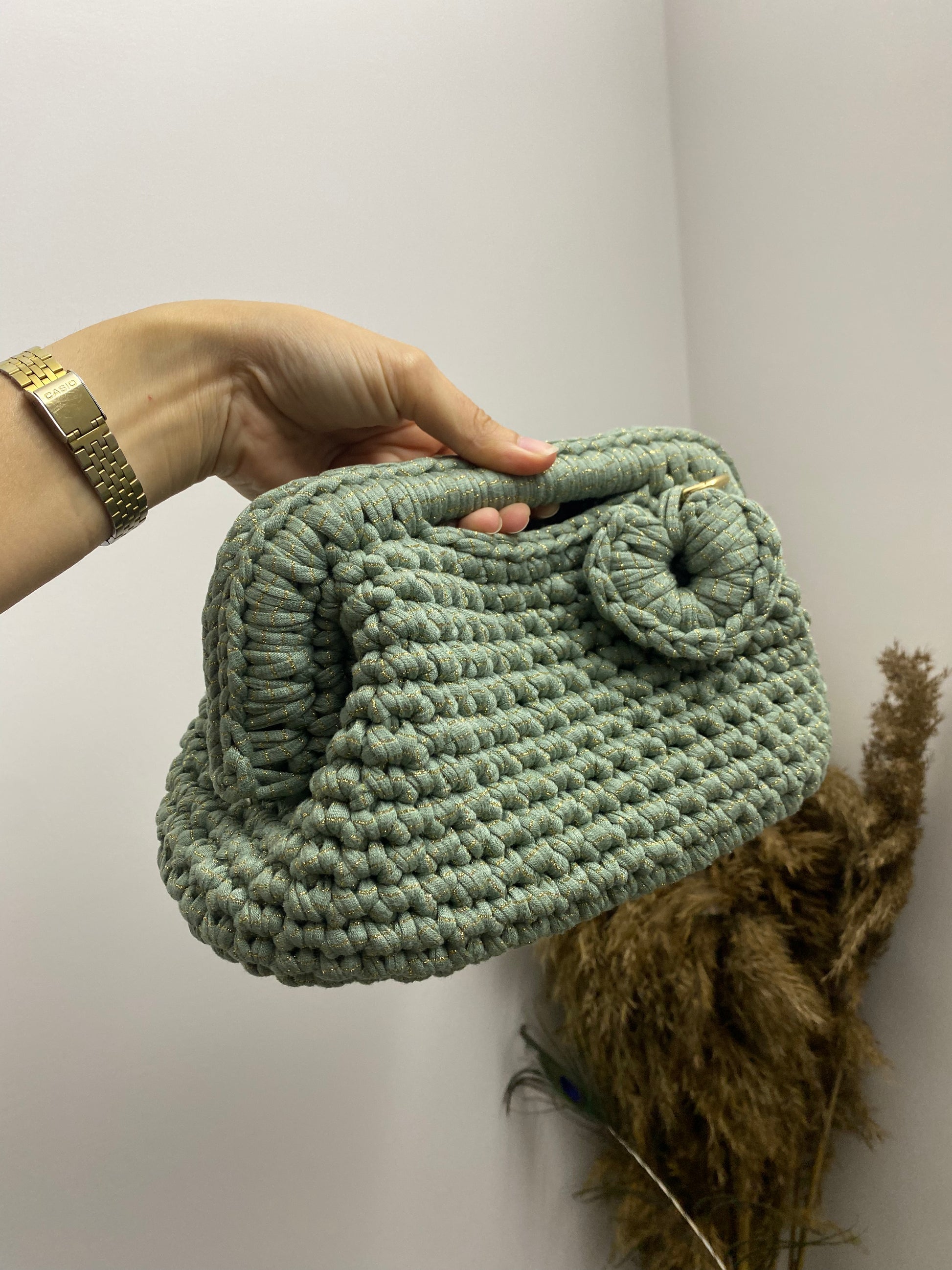 Borsa Pochette media verde con dettagli oro in cotone fatta a mano e charme a cuore